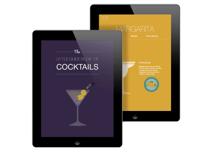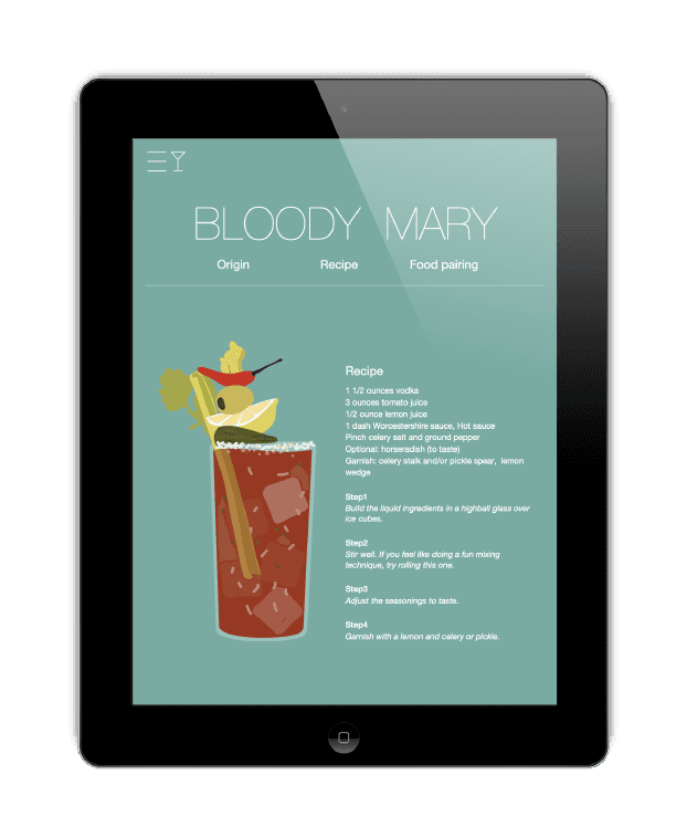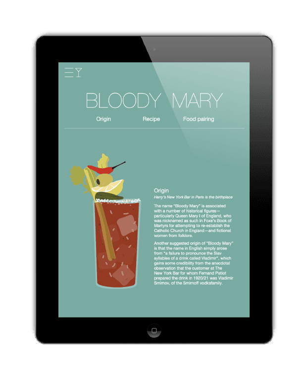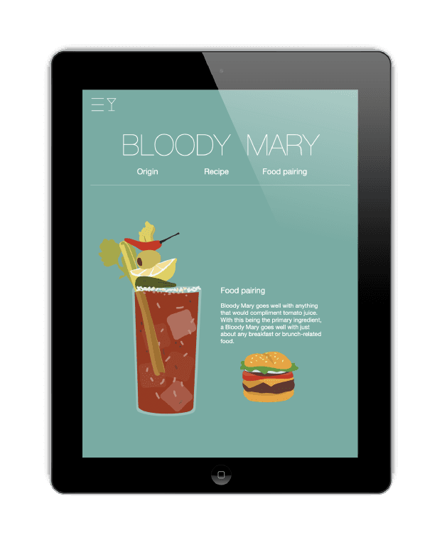 The Book consists of 6 different types of popular cocktails with animations. It starts with the table page so that viewers can navigate to different pages anytime. In addition, each cocktail page has contents of the origin, recipe, and food pairing.