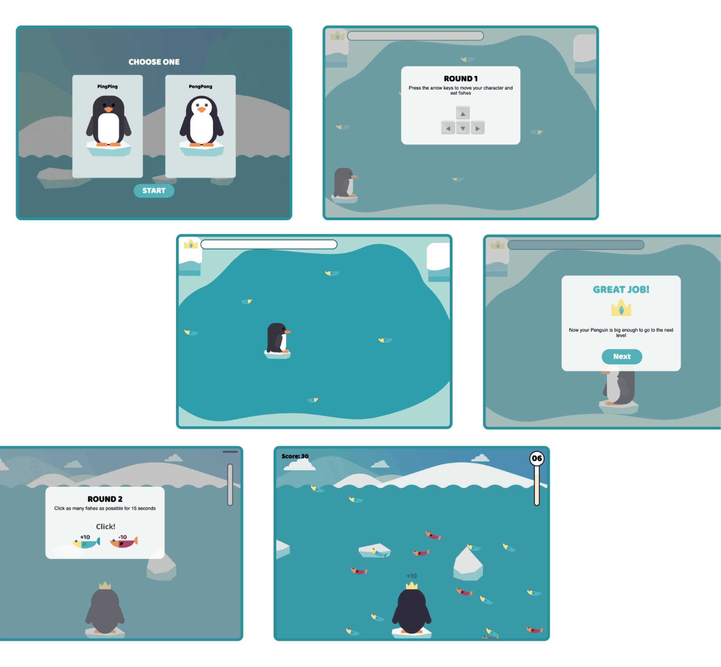 I created all of the graphic assets and developed dynamic functions that allow users to move a character, click on moving fish to get points, and so on.